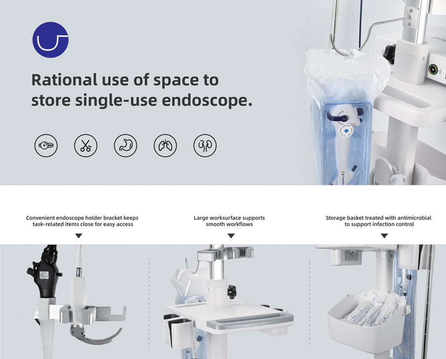 Convenient endoscope holder bracket keeps task-related items close for easy access. Large worksurface supports smooth workflows. Storage basket treated with antimicrobial to support infection control.